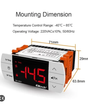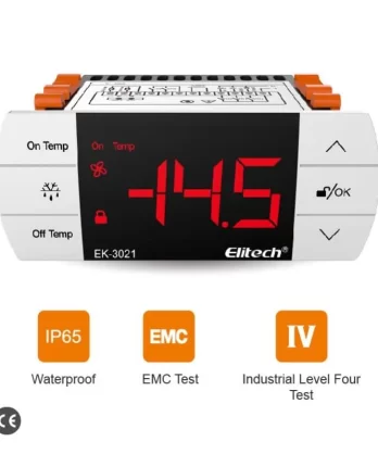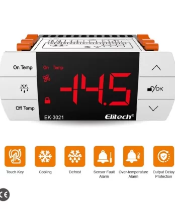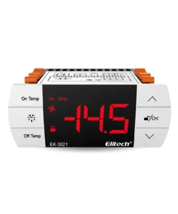 Elitech EK-3021 (EK3021) là bộ điều khiển nhiệt độ với các phím cảm ứng. Thiết bị phù hợp cho việc kiểm soát nhiệt độ trong các ứng dụng làm lạnh và xả đá. EK-3021 tích hợp các chức năng: đo nhiệt độ, hiển thị nhiệt độ, điều khiển nhiệt độ, hiệu chỉnh nhiệt độ, xả đá cưỡng bức, cảnh báo quá nhiệt và cảnh báo lỗi cảm biến. Thiết bị hỗ trợ khôi phục cài đặt gốc chỉ với một nút nhấn, giúp việc điều chỉnh tham số trở nên đơn giản hơn.