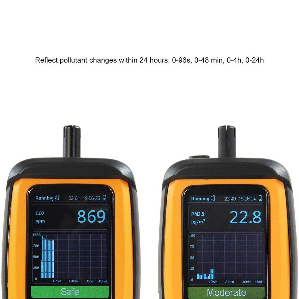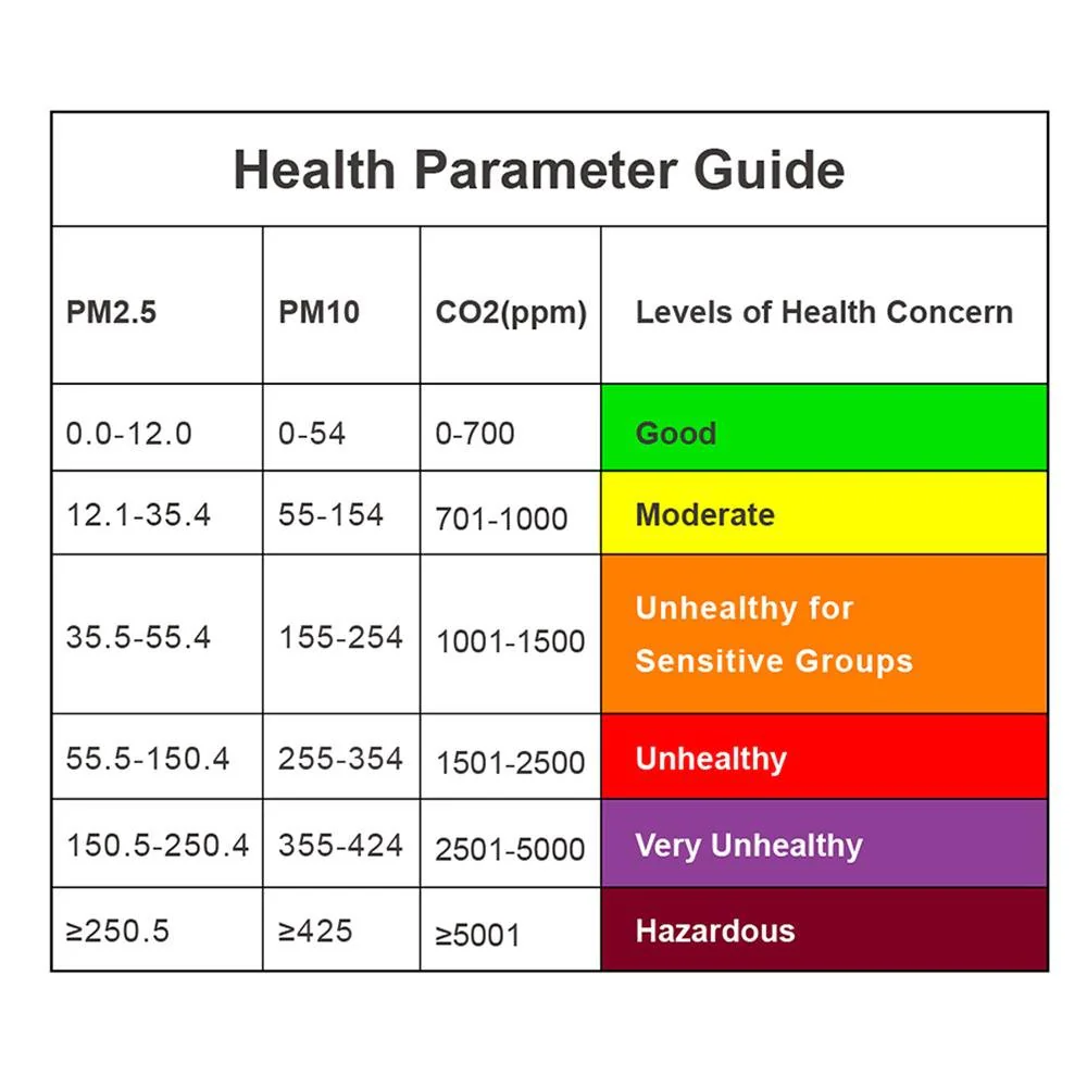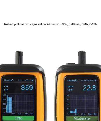 - Máy dò này phát hiện các hạt PM2.5 & PM10, CO2, Nhiệt độ và Độ ẩm.