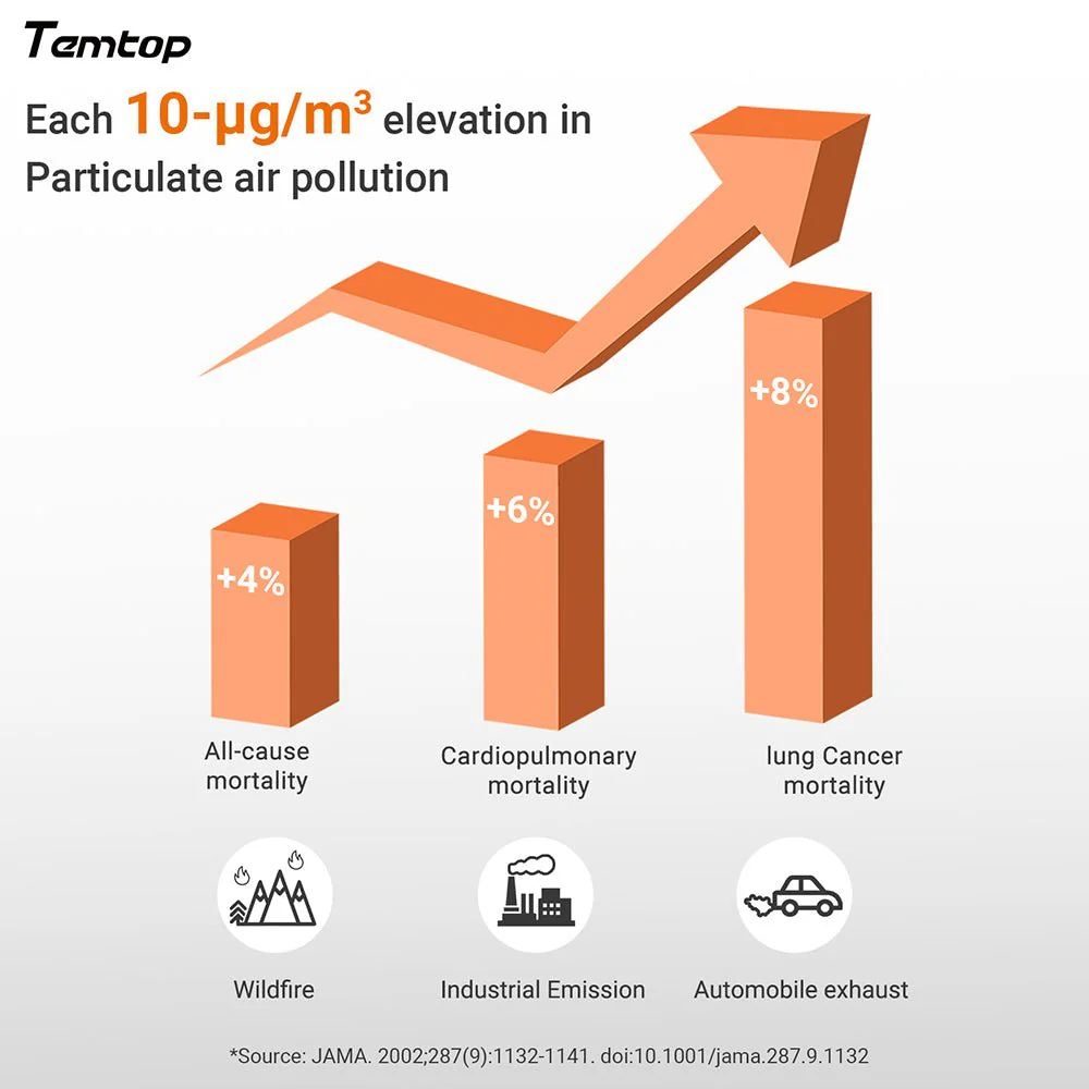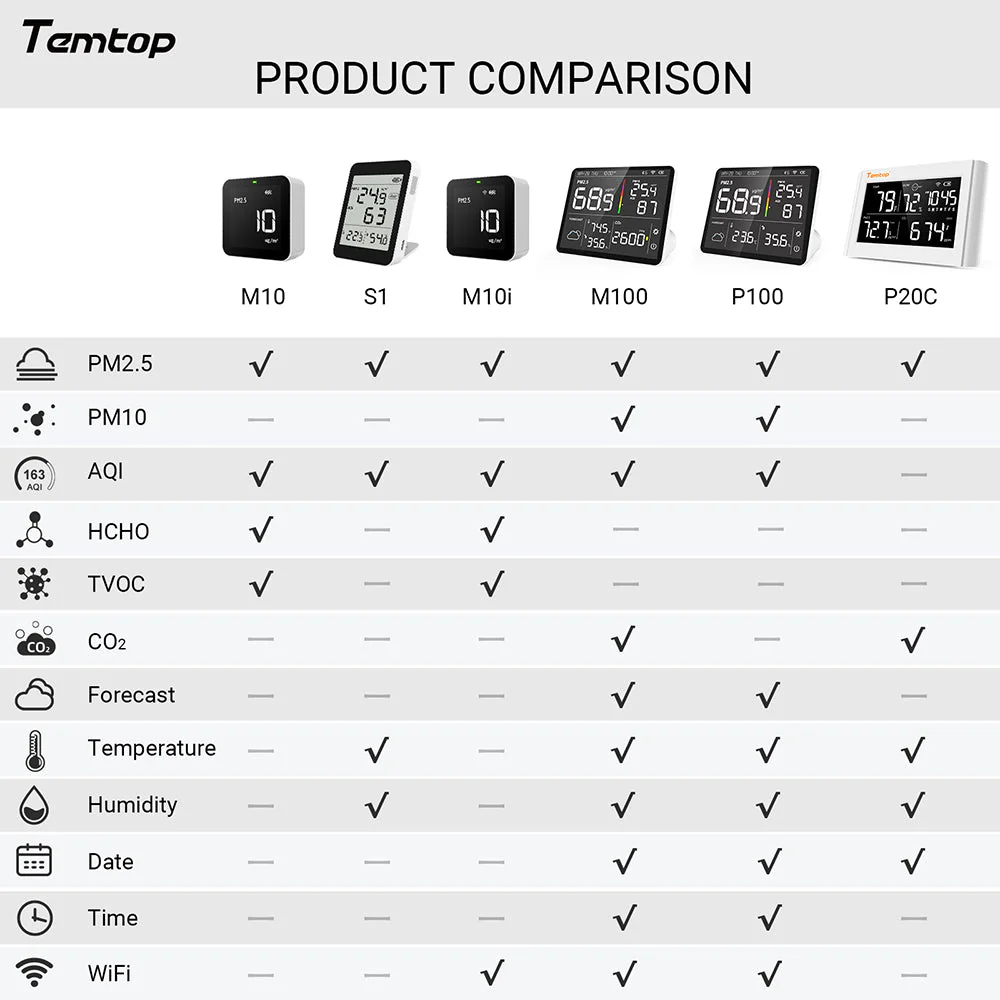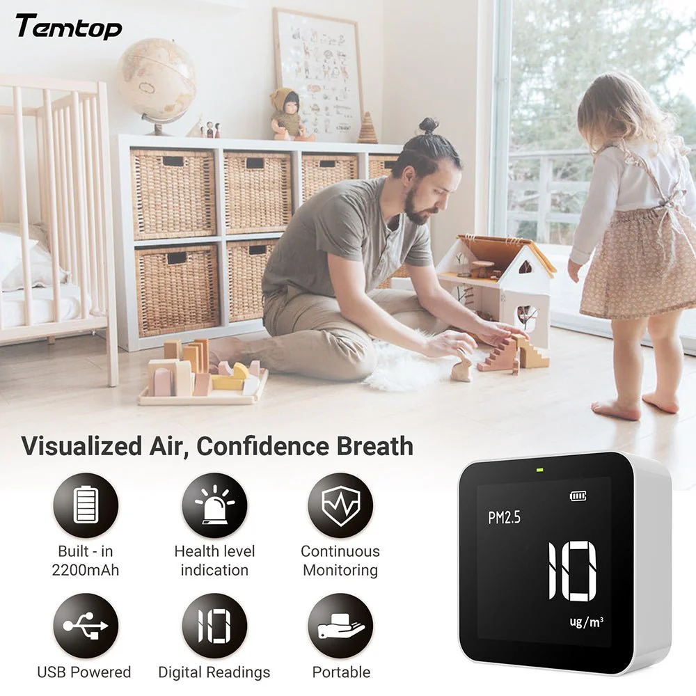 Máy theo dõi chất lượng không khí Temtop M10 phát hiện các hạt PM2.5, HCHO, TVOC và AQI trong nhiều trường hợp khác nhau và hiển thị dữ liệu thời gian thực để mang lại cho bạn một môi trường an toàn và lành mạnh.