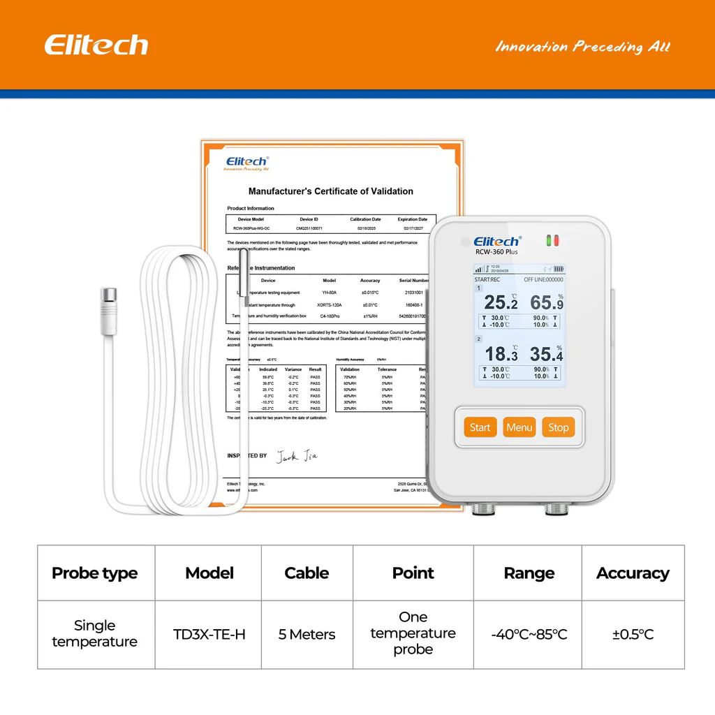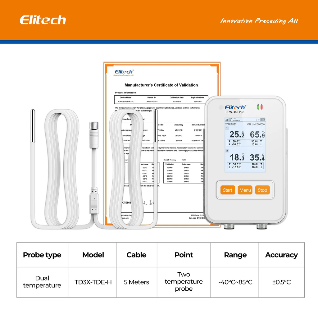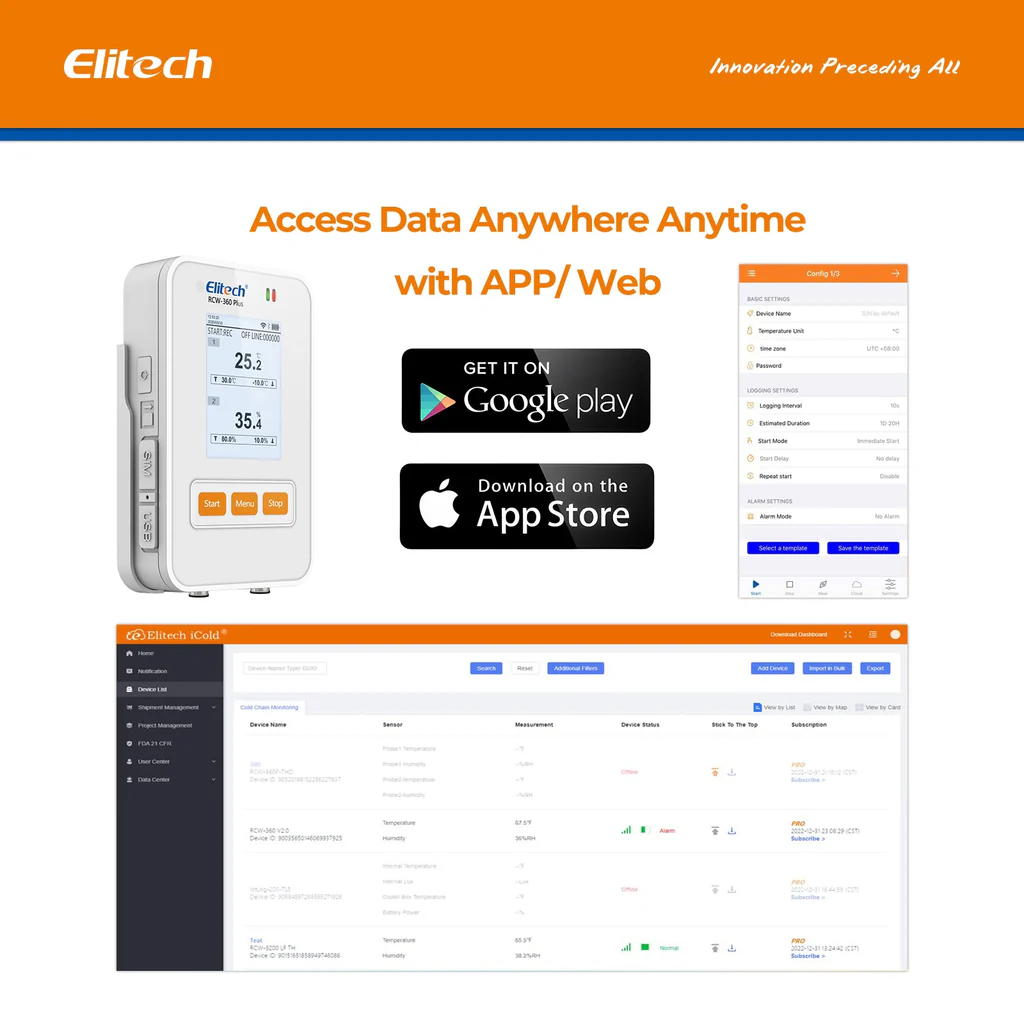 Elitech RCW-360 Plus 4G là phiên bản cập nhật của RCW-360 4G, hỗ trợ theo dõi nhiệt độ, cảnh báo, ghi dữ liệu, tải lên dữ liệu, in qua Bluetooth và định vị GSP. Nó được sử dụng rộng rãi trong thực phẩm, dịch vụ ăn uống, hậu cần và các ngành công nghiệp yêu cầu chứng nhận hệ thống HACCP.